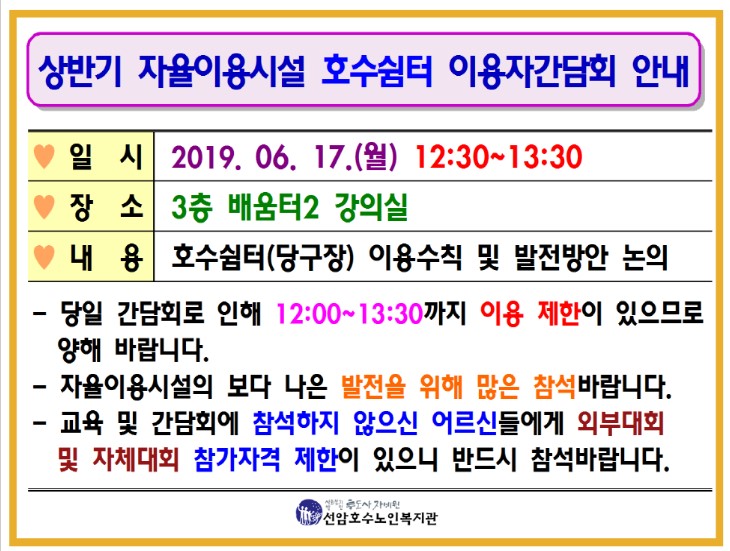 상반기 자율이용시설 호수쉼터(당구장) 이용자 간담회 안내 [2019-05-29]