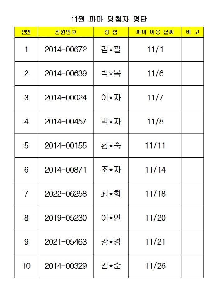 11월 이·미용서비스 파마 당첨자 안내 페이지 정보 작성자 선암호수노인복지관 댓글 0건 조회Hit 368회 작성일Date 24-10-30 17:56 본문 11월 이·미용서비스 파마 당첨자 명단입니다.당첨자분들은 각자 파마 이용 날짜 전에 반드시 2층 사무실에 내방하여 접수증을 수령해가시기바랍니다^^~ 목록 댓글목록 댓글목록 등록된 댓글이 없습니다.