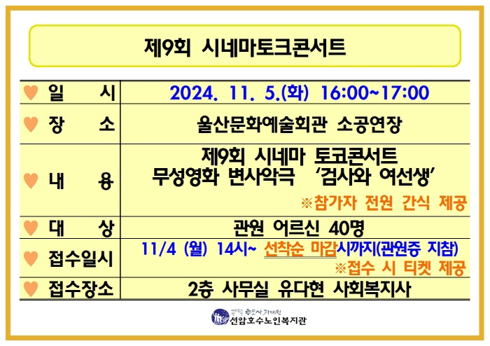 지역사회행사-제9회 시네마토크콘서트 행사 참여자 모집 페이지 정보 작성자 선암호수노인복지관 댓글 0건 조회Hit 334회 작성일Date 24-11-04 11:18 본문 어르신들의 많은 관심과 참여 부탁드리겠습니다~ *사무실 접수 즉시 티켓 제공 목록 댓글목록 댓글목록 등록된 댓글이 없습니다.