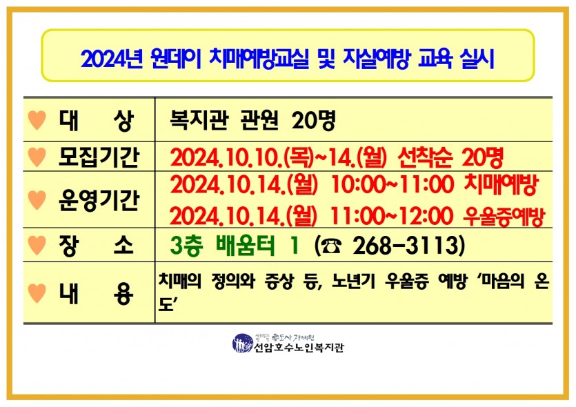 원데이 치매예방교실 및 자살예방 교육 실시 페이지 정보 작성자 선암호수노인복지관 댓글 0건 조회Hit 562회 작성일Date 24-10-13 10:51 본문 2024년 원데이 치매예방교실 및 자살예방교육을 실시합니다.많은 관심과 참여바랍니다.. 목록 댓글목록 댓글목록 등록된 댓글이 없습니다.