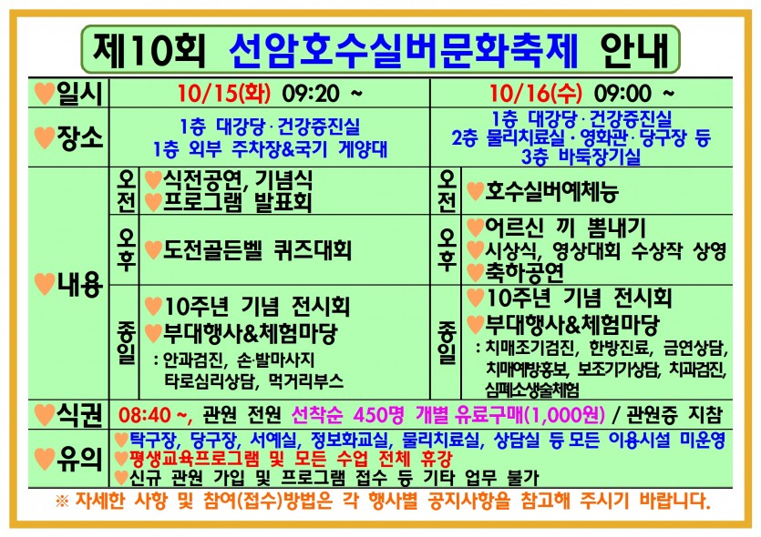 제10회 선암호수실버문화축제 안내 페이지 정보 작성자 선암호수노인복지관 댓글 0건 조회Hit 807회 작성일Date 24-09-19 09:09 본문 어르신들의 많은 참여 바랍니다.^^ 목록 댓글목록 댓글목록 등록된 댓글이 없습니다.