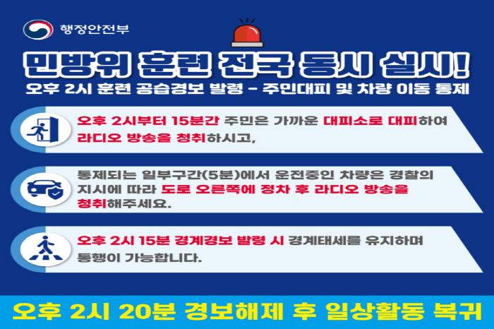 2024년 8월 22일 을지연습 연계 공습대비 민방위 훈련 실시 페이지 정보 작성자 선암호수노인복지관 댓글 0건 조회Hit 747회 작성일Date 24-08-16 15:30 본문 목록 댓글목록 댓글목록 등록된 댓글이 없습니다.