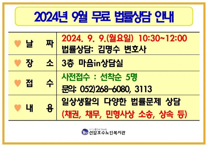 2024년 9월 무료법률상담 실시 페이지 정보 작성자 선암호수노인복지관 댓글 0건 조회Hit 543회 작성일Date 24-08-26 14:04 본문 2024년 9월 무료법률상담 실시 합니다.접수기간 : 2024.08.26(월) ~ 9.5(목)까지많은 관심 부탁드려요.. 목록 댓글목록 댓글목록 등록된 댓글이 없습니다.