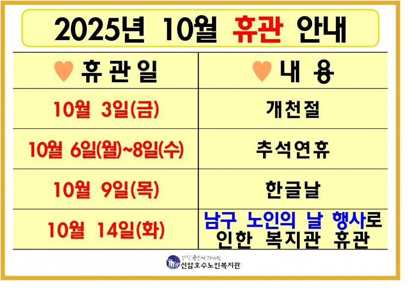 10월 복지관 휴관안내 페이지 정보 작성자 선암호수노인복지관 댓글 0건 조회Hit 266회 작성일Date 25-09-22 16:16 본문 10월 복지관 휴관안내 목록 댓글목록 댓글목록 등록된 댓글이 없습니다.