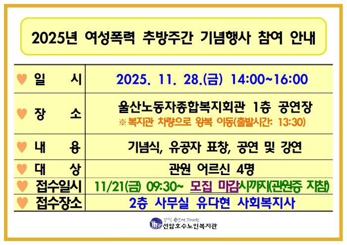 지역사회행사-2025년 여성폭력 추방주간 기념행사 참여자 모집(마감) 페이지 정보 작성자 선암호수노인복지관 댓글 0건 조회Hit 56회 작성일Date 25-11-20 16:53 본문 어르신들의 많은 관심과 참여 부탁드리겠습니다*^^* 목록 댓글목록 댓글목록 등록된 댓글이 없습니다.