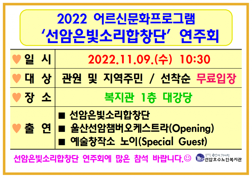 2022 어르신문화프로그램 ‘선암은빛소리합창단’ 연주회 페이지 정보 작성자 관리자 댓글 0건 조회Hit 632회 작성일Date 22-10-19 11:56 본문 2022 어르신문화프로그램 ‘선암은빛소리합창단’ 연주회 목록 댓글목록 댓글목록 등록된 댓글이 없습니다.