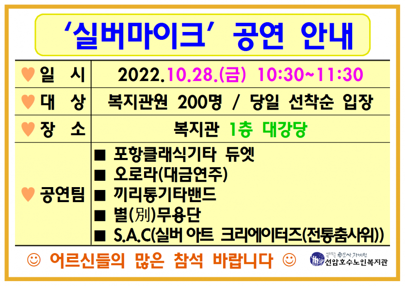 ‘실버마이크’ 공연 안내 페이지 정보 작성자 관리자 댓글 0건 조회Hit 845회 작성일Date 22-10-19 11:58 본문 ‘실버마이크’ 공연 안내 목록 댓글목록 댓글목록 등록된 댓글이 없습니다.