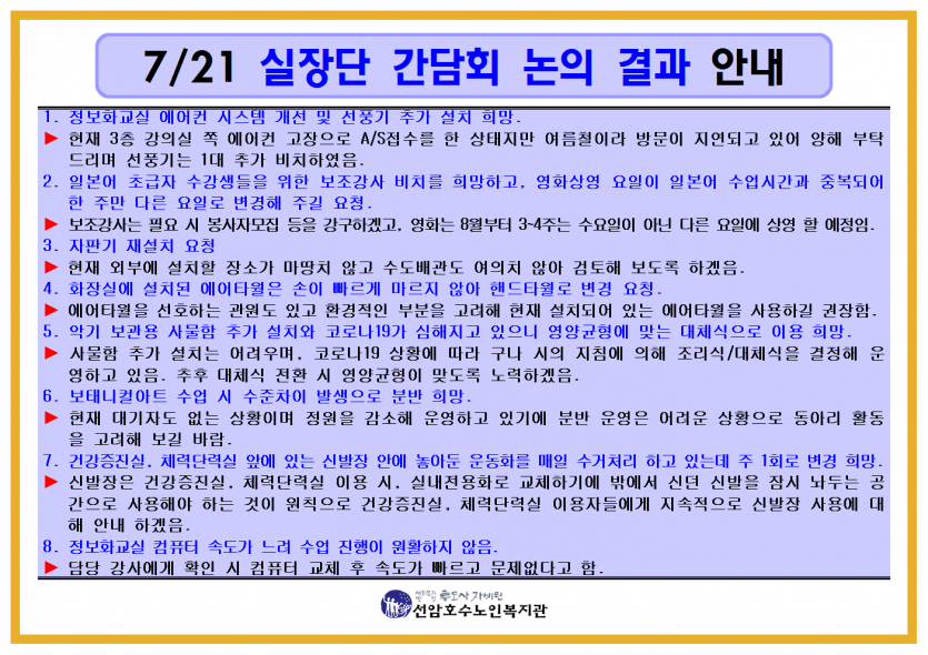 7/21 실장단 간담회 논의 결과 안내 페이지 정보 작성자 관리자 댓글 0건 조회Hit 1,948회 작성일Date 22-07-25 14:30 본문 7/21 실장단 간담회 논의 결과 안내 목록 댓글목록 댓글목록 등록된 댓글이 없습니다.