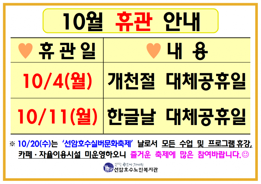10월 복지관 휴관 안내 페이지 정보 작성자 관리자 댓글 0건 조회Hit 850회 작성일Date 21-09-24 09:49 본문 10월 복지관 휴관 안내 목록 댓글목록 댓글목록 등록된 댓글이 없습니다.