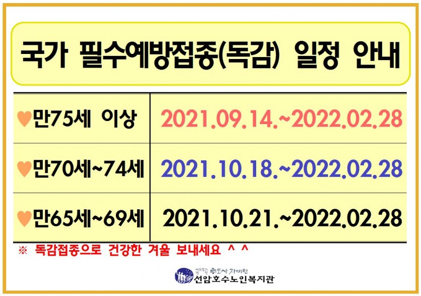 국가 필수예방접종(독감) 일정 안내 페이지 정보 작성자 관리자 댓글 0건 조회Hit 612회 작성일Date 21-09-29 13:18 본문 국가 필수예방접종(독감) 일정 안내 목록 댓글목록 댓글목록 등록된 댓글이 없습니다.