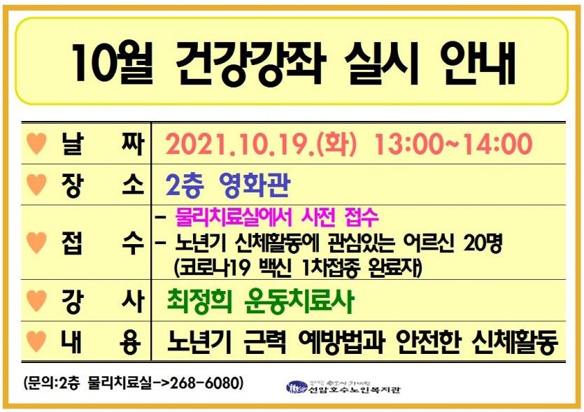 10월 건강강좌 실시 안내 페이지 정보 작성자 관리자 댓글 0건 조회Hit 715회 작성일Date 21-10-15 13:36 본문 10월 건강강좌 실시 안내 목록 댓글목록 댓글목록 등록된 댓글이 없습니다.