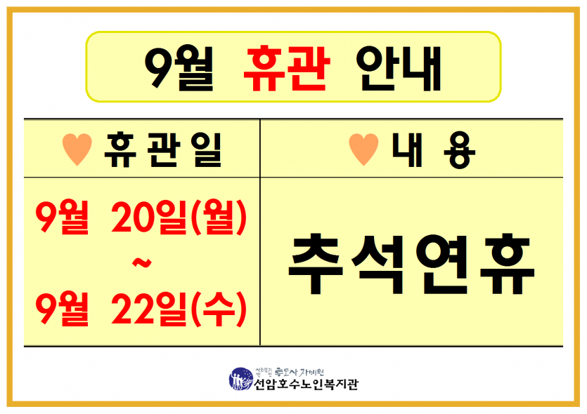 9월 휴관 안내(추석연휴) 페이지 정보 작성자 관리자 댓글 0건 조회Hit 808회 작성일Date 21-08-30 15:54 본문 9월 휴관 안내(추석연휴) 목록 댓글목록 댓글목록 등록된 댓글이 없습니다.