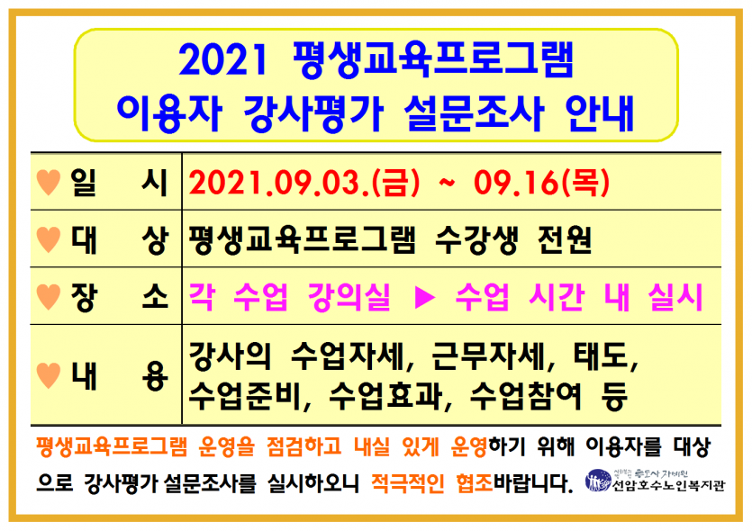 2021 평생교육프로그램 이용자 강사평가 설문조사 안내 페이지 정보 작성자 관리자 댓글 0건 조회Hit 700회 작성일Date 21-09-02 09:38 본문 2021 평생교육프로그램 이용자 강사평가 설문조사 안내 목록 댓글목록 댓글목록 등록된 댓글이 없습니다.