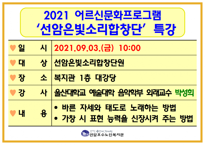 2021 어르신문화프로그램 ‘선암은빛소리합창단’ 특강 페이지 정보 작성자 관리자 댓글 0건 조회Hit 788회 작성일Date 21-08-23 13:49 본문 2021 어르신문화프로그램 ‘선암은빛소리합창단’ 특강 목록 댓글목록 댓글목록 등록된 댓글이 없습니다.
