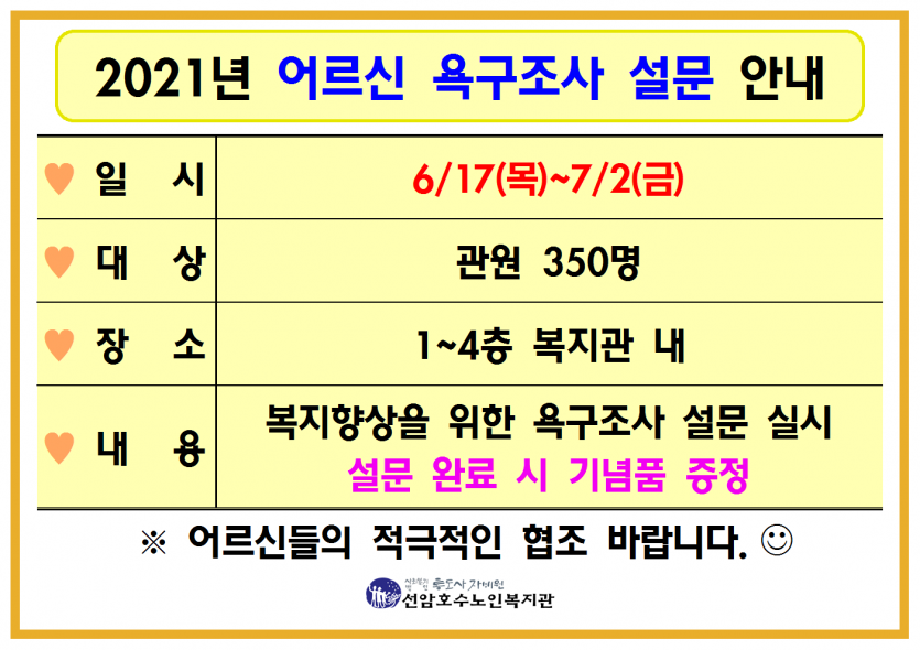 2021년 어르신 욕구조사 설문 안내 페이지 정보 작성자 관리자 댓글 0건 조회Hit 931회 작성일Date 21-06-14 17:58 본문 2021년 어르신 욕구조사 설문 안내 목록 댓글목록 댓글목록 등록된 댓글이 없습니다.
