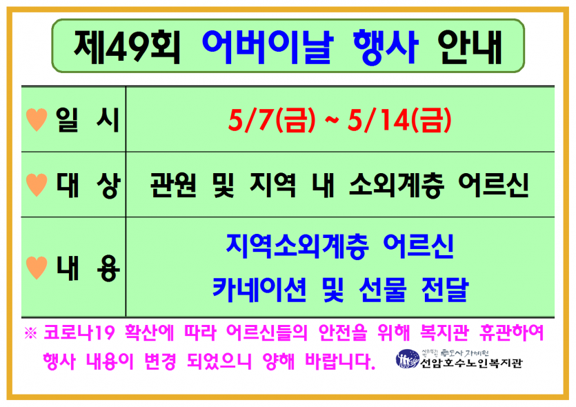 제49회 어버이날 행사 안내(내용 변경) 페이지 정보 작성자 관리자 댓글 0건 조회Hit 899회 작성일Date 21-04-14 09:32 본문 제49회 어버이날 행사 안내 목록 댓글목록 댓글목록 등록된 댓글이 없습니다.