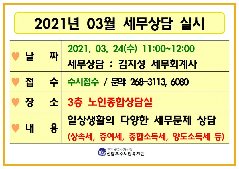2021년 3월 무료세무상담 실시안내 페이지 정보 작성자 관리자 댓글 0건 조회Hit 753회 작성일Date 21-03-12 16:54 본문 2021년 3월 무료 세무상담을 실시합니다. 목록 댓글목록 댓글목록 등록된 댓글이 없습니다.
