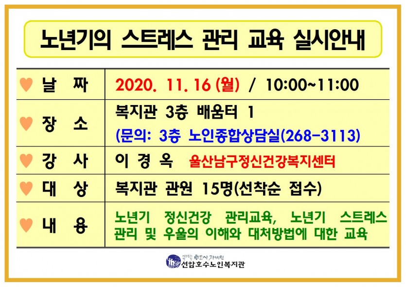 2020년 노년기 스트레스 관리교육 실시안내 페이지 정보 작성자 관리자 댓글 0건 조회Hit 1,123회 작성일Date 20-11-11 14:52 본문 2020년 노년기 스트레스 관리교육 실시안내 목록 댓글목록 댓글목록 등록된 댓글이 없습니다.