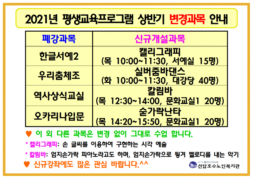 ※ 신규과목에 대한 좀 더 자세한 정보를 알고 싶은 관원은 선암호수노인복지관홈페이지 "자료실 - 온라인 평생교육프로그램" 탭에서 확인 가능합니다. http://www.sunamswc.or.kr/contents/bbs/board.php?bo_table=edupro&wr_id=5 ⇦ 이 주소를 클릭하면 "온라인 평생교육프로그램" 탭으로 바로 연결 됩니다.^^