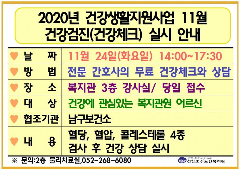 2020년 건강생활지원사업 11월 건강검진(건강체크) 실시 안내 페이지 정보 작성자 관리자 댓글 0건 조회Hit 712회 작성일Date 20-11-19 13:21 본문 2020년 건강생활지원사업 11월 건강검진(건강체크) 실시 안내 목록 댓글목록 댓글목록 등록된 댓글이 없습니다.
