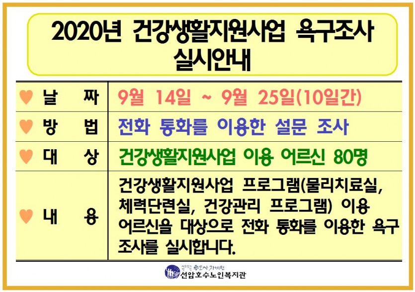 2020년 정서생활지원사업 및 건강생활지원사업 만족도 및 욕구조사 실시안내