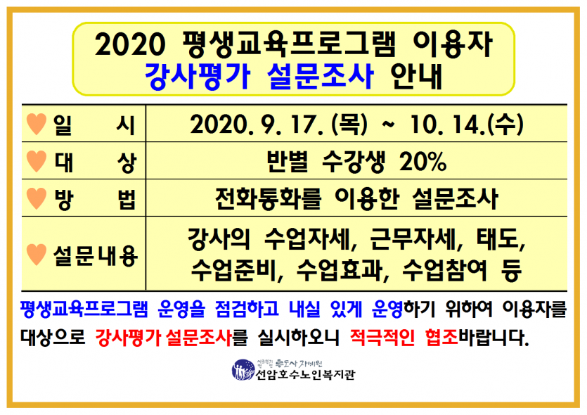 2020 평생교육프로그램 이용자 강사평가 설문조사 안내 페이지 정보 작성자 관리자 댓글 0건 조회Hit 826회 작성일Date 20-09-15 15:50 본문 2020 평생교육프로그램 이용자 강사평가 설문조사 안내 목록 댓글목록 댓글목록 등록된 댓글이 없습니다.