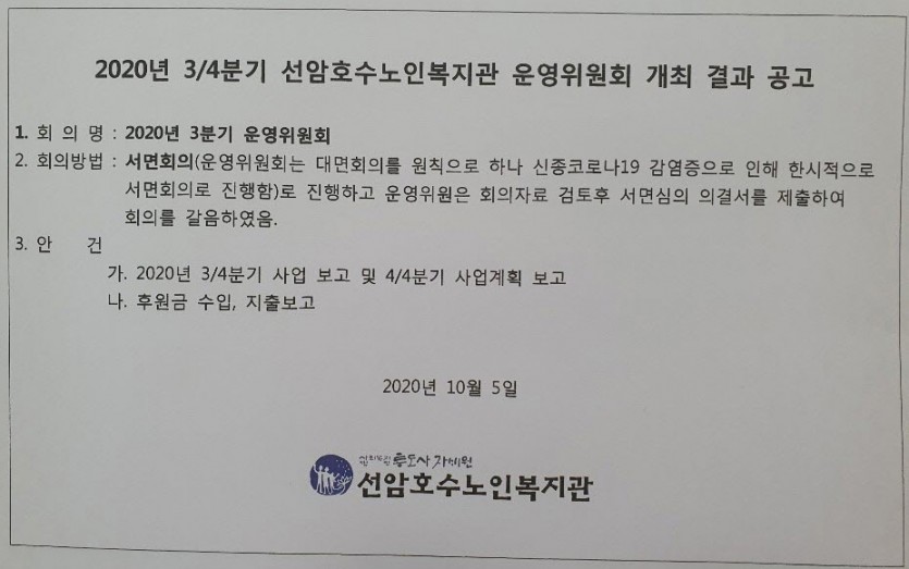 2020년 3분기 선암호수노인복지관 운영위원회 개최 결과