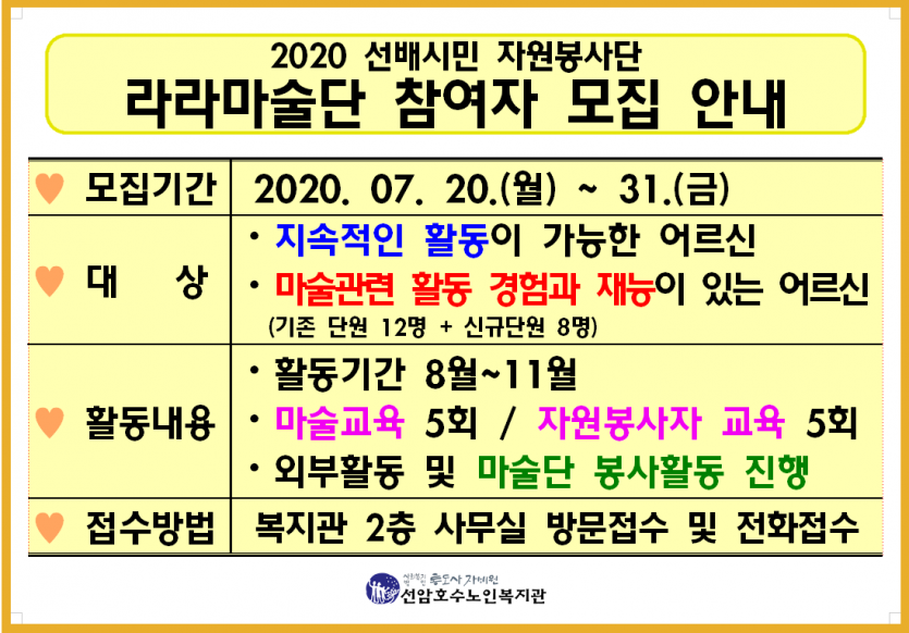 2020년 선배시민 자원봉사단 ‘라라마술단’ 참여자 모집 합니다.