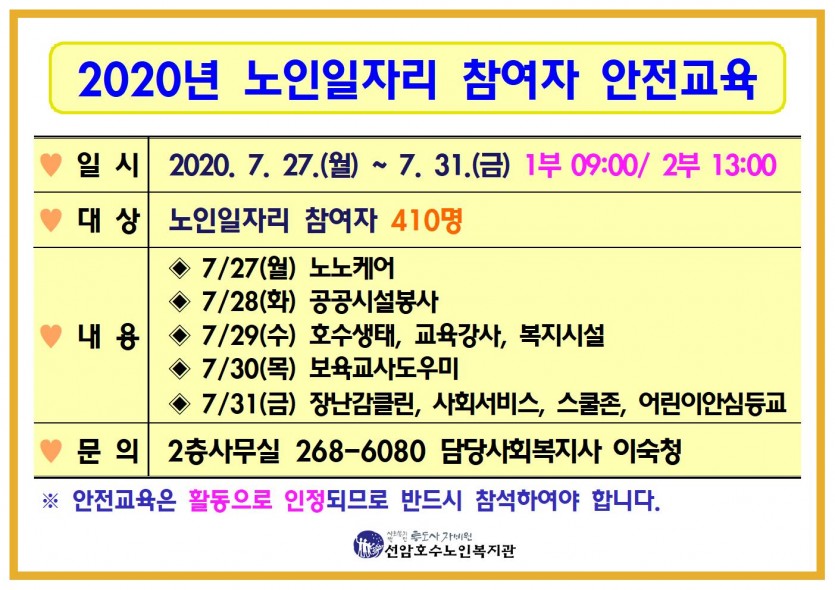 2020년 노인일자리 및 사회활동지원사업 참여자 안전교육 실시 안내