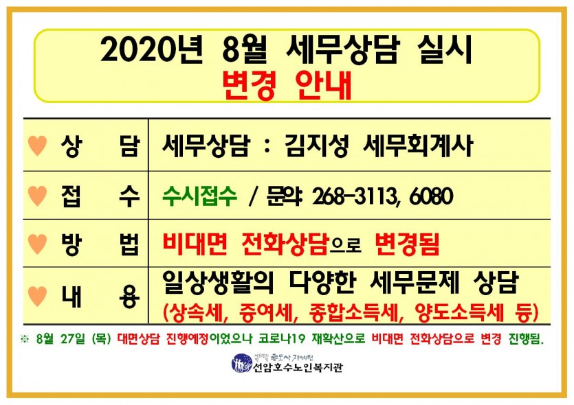 2020년 8월 세무상담 실시 변경안내 페이지 정보 작성자 관리자 댓글 0건 조회Hit 593회 작성일Date 20-08-20 08:35 본문 2020년 8월 세무상담 실시 변경안내 목록 댓글목록 댓글목록 등록된 댓글이 없습니다.