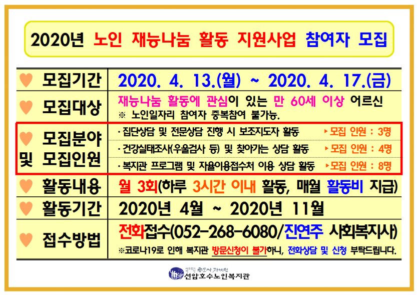 [접수일정 재공지]-2020년 노인 재능나눔 활동 지원사업 참여자 모집 안내