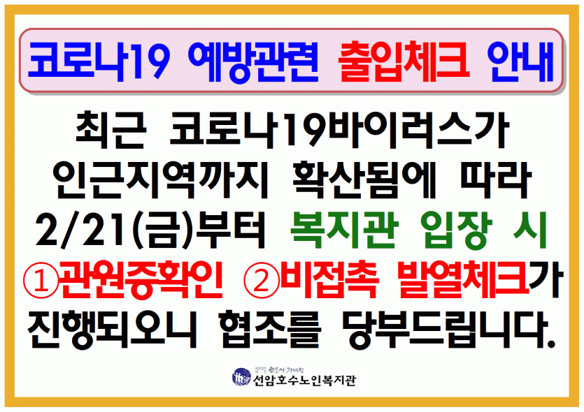 코로나19 예방관련 출입체크 안내 페이지 정보 작성자 관리자 댓글 0건 조회Hit 613회 작성일Date 20-02-20 12:10 본문 코로나19 예방관련 출입체크 안내 및 외부방문객 입장제한 안내 목록 댓글목록 댓글목록 등록된 댓글이 없습니다.