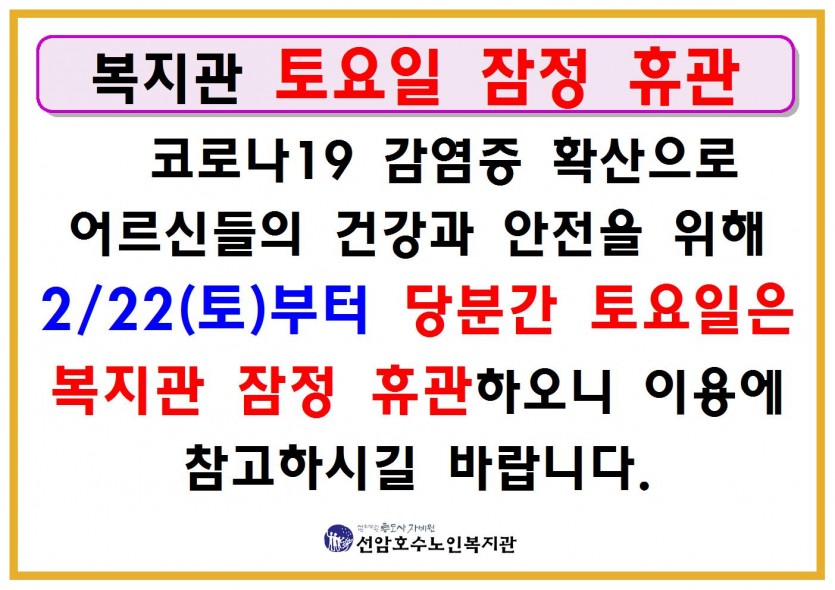 복지관 토요일 잠정 휴관 안내 페이지 정보 작성자 관리자 댓글 0건 조회Hit 738회 작성일Date 20-02-20 16:46 본문 복지관 토요일 잠정 휴관 안내 목록 댓글목록 댓글목록 등록된 댓글이 없습니다.