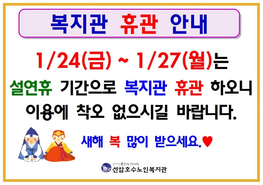 1월 휴관 안내 페이지 정보 작성자 관리자 댓글 0건 조회Hit 743회 작성일Date 20-01-15 10:51 본문 1월 휴관 안내 목록 댓글목록 댓글목록 등록된 댓글이 없습니다.
