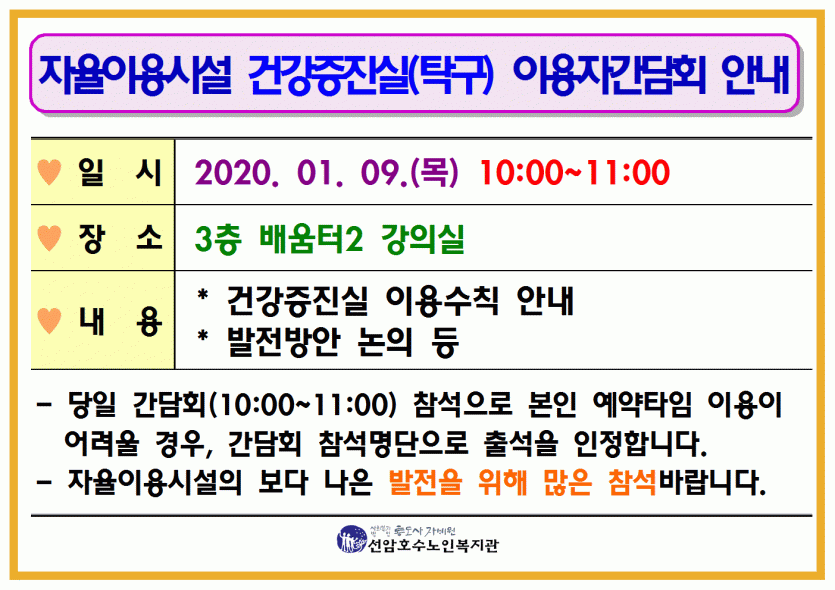 2020년 1월 자율이용시설 건강증진실(탁구) 이용자간담회 안내 페이지 정보 작성자 관리자 댓글 0건 조회Hit 736회 작성일Date 20-01-08 09:11 본문 2020년 1월 자율이용시설 건강증진실(탁구) 이용자간담회 안내 목록 댓글목록 댓글목록 등록된 댓글이 없습니다.