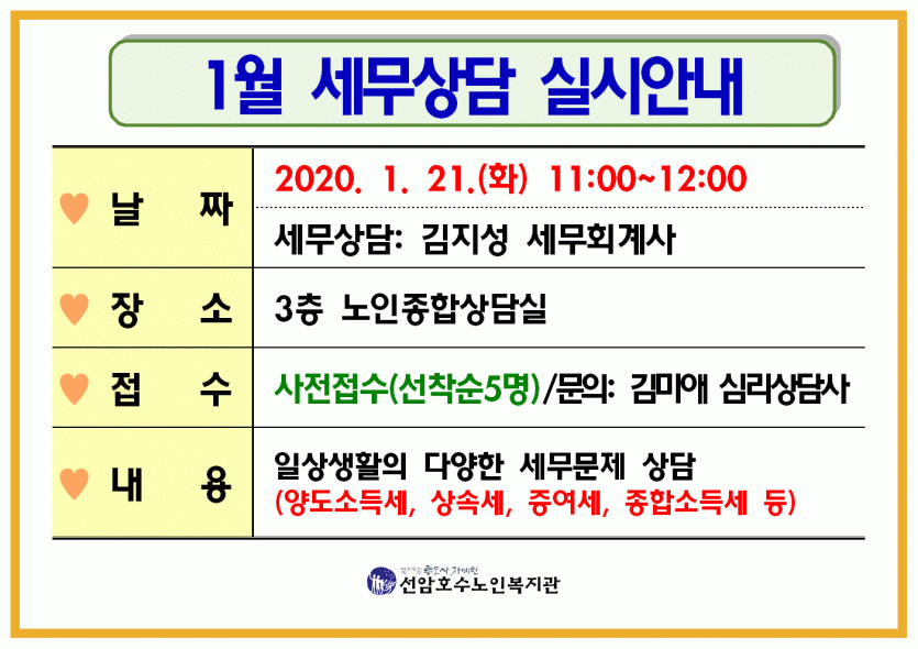 2020년 1월 무료 세무상담 실시안내 페이지 정보 작성자 관리자 댓글 0건 조회Hit 700회 작성일Date 20-01-08 13:20 본문 2020년 1월 21일 화요일 무료 세무상담을 실시합니다. 목록 댓글목록 댓글목록 등록된 댓글이 없습니다.