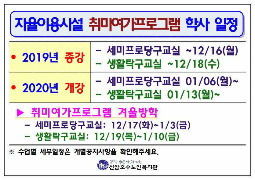 평생교육프로그램 및 취미여가프로그램 학사 일정