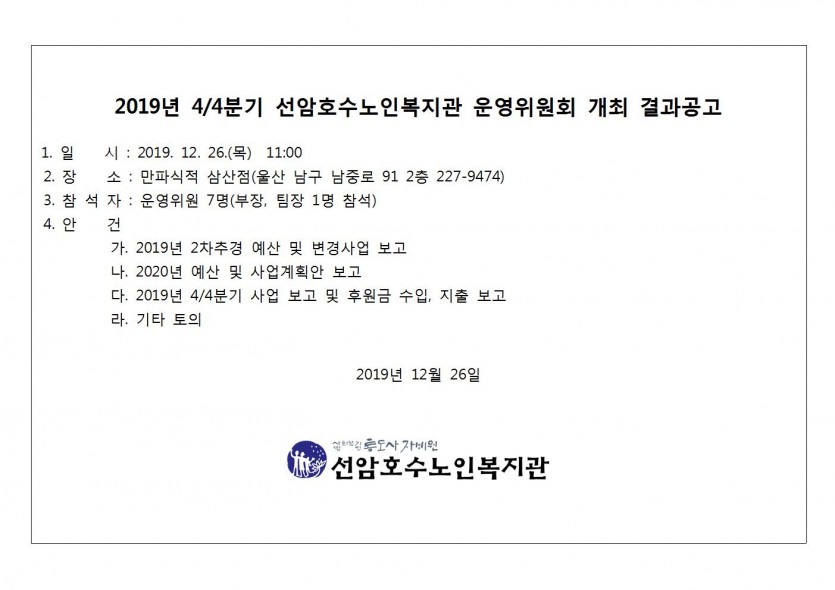 2019년 4/4분기 운영위원회 개최 결과 공고
