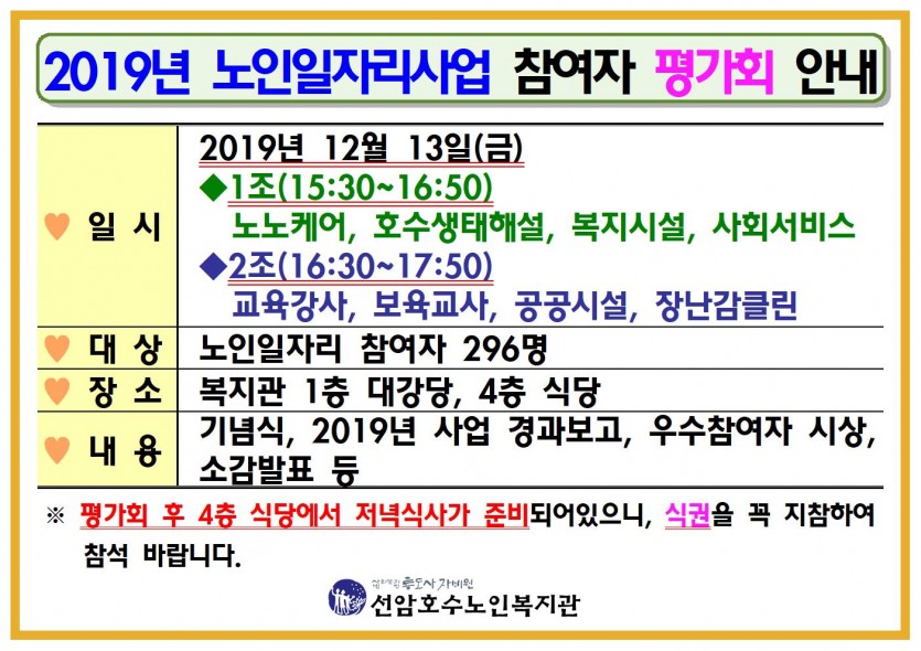 2019년 노인일자리사업 참여자 평가회 안내 페이지 정보 작성자 관리자 댓글 0건 조회Hit 607회 작성일Date 19-11-29 10:24 본문 2019년 노인일자리사업 참여자 평가회 안내 목록 댓글목록 댓글목록 등록된 댓글이 없습니다.