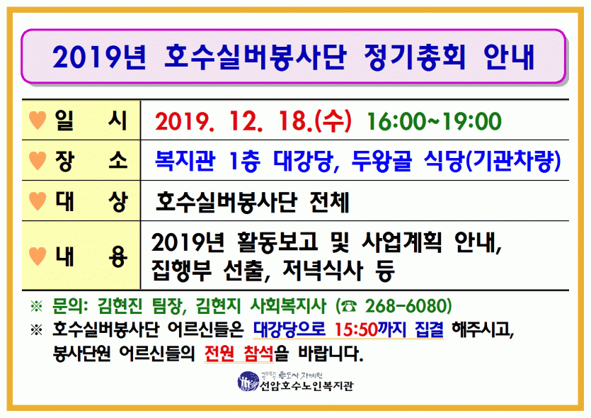 2019년 호수실버봉사단 정기총회 안내 페이지 정보 작성자 관리자 댓글 0건 조회Hit 752회 작성일Date 19-12-04 15:08 본문 2019년 호수실버봉사단 정기총회 안내 목록 댓글목록 댓글목록 등록된 댓글이 없습니다.