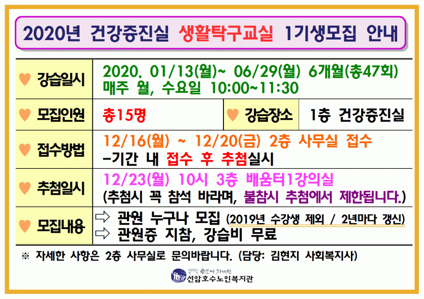 2020년 건강증진실 생활탁구교실 1기생모집 안내 페이지 정보 작성자 관리자 댓글 0건 조회Hit 933회 작성일Date 19-12-09 08:42 본문 2020년 건강증진실 생활탁구교실 1기생모집 안내 목록 댓글목록 댓글목록 등록된 댓글이 없습니다.