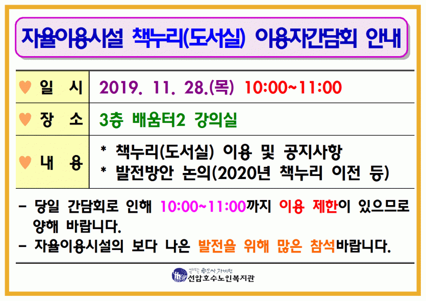 2019년 자율이용시설 책누리(도서실) 이용자간담회 안내(수정) 페이지 정보 작성자 관리자 댓글 0건 조회Hit 659회 작성일Date 19-11-19 14:15 본문 2019년 자율이용시설 책누리(도서실) 이용자간담회 안내 목록 댓글목록 댓글목록 등록된 댓글이 없습니다.