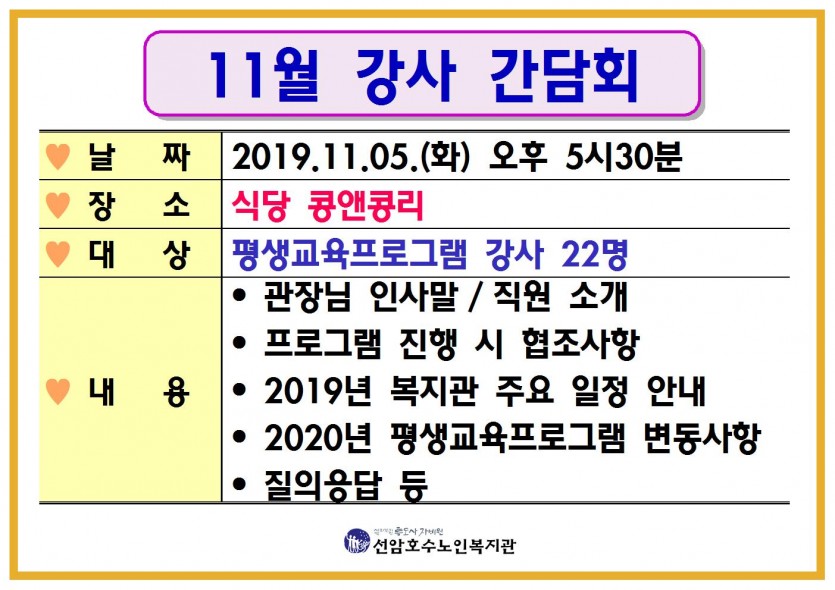 2019년 11월 강사 간담회 페이지 정보 작성자 관리자 댓글 0건 조회Hit 833회 작성일Date 19-10-29 08:45 본문 2019년 11월 강사 간담회 목록 댓글목록 댓글목록 등록된 댓글이 없습니다.