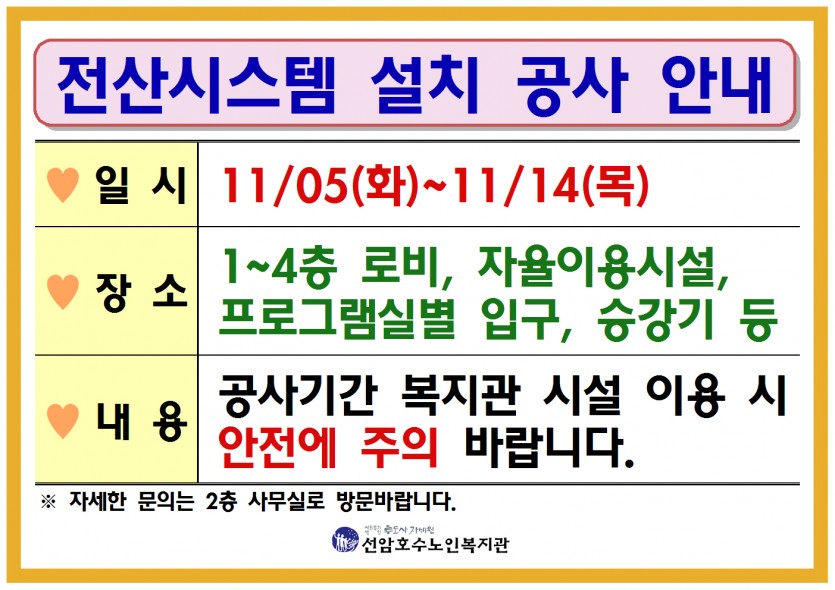 전산시스템 설치 공사 안내(수정) 페이지 정보 작성자 관리자 댓글 0건 조회Hit 845회 작성일Date 19-11-01 10:17 본문 전산시스템 설치 공사 안내 목록 댓글목록 댓글목록 등록된 댓글이 없습니다.