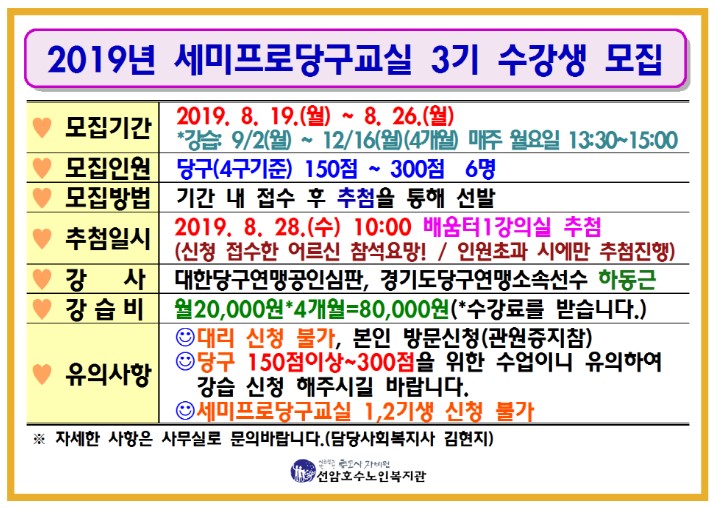 2019년 세미프로당구교실 3기 수강생 모집 [2019-08-19]