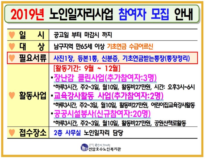 2019년 노인일자리사업 참여자 모집 안내 [2019-08-20]