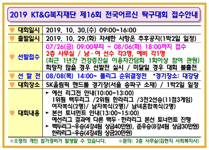 2019 KT&G복지재단 제16회 전국어르신 탁구대회 접수안내(종료) [2019-07-26]