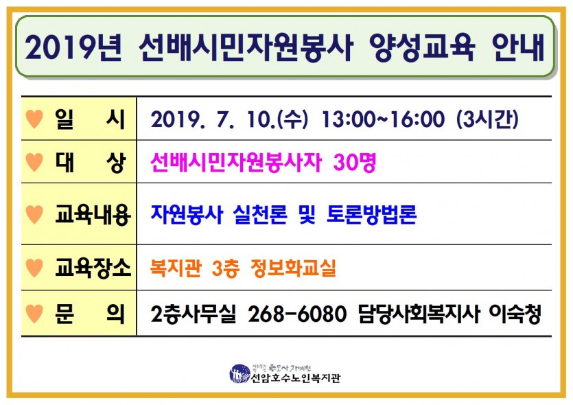 2019년 선배시민자원봉사 양성교육 안내 [2019-07-02]