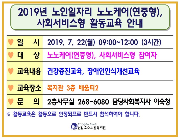 2019년 노인일자리 노노케어(연중형), 사회서비스형 활동교육 안내 [2019-07-17]