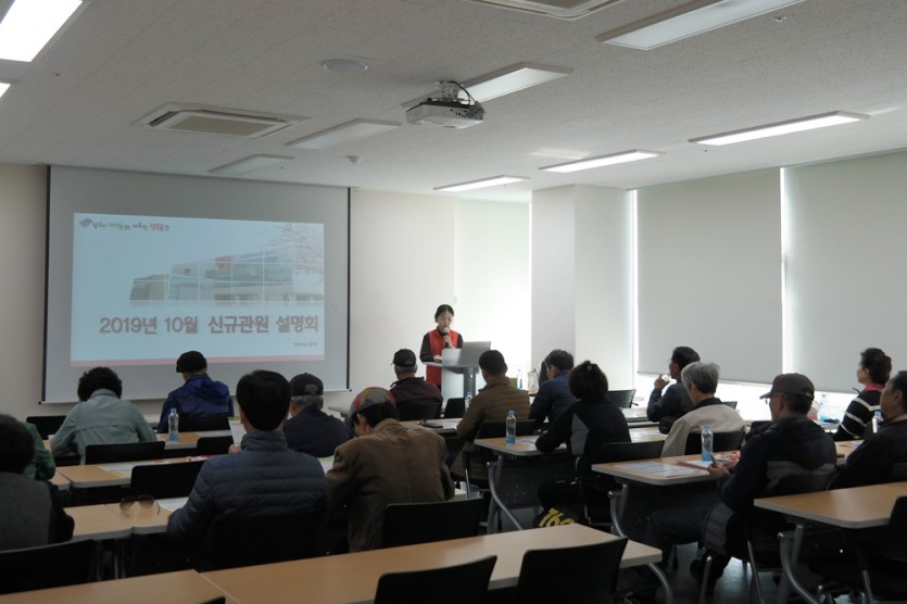 2019년 10월 29일(화) 9~10월 동안 선암호수노인복지관에 신규로 가입한 어르신들을 대상으로 복지관내 지켜야 할 이용 수칙, 자율이용시설 안내등을 통해 건전한 복지관 이용 문화를 형성하고자 신규관원설명회를 실시하였고, 마지막에 질의응답시간도 가져 유익한 시간이였습니다.